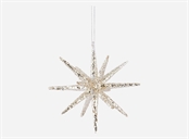 Julestjerne - men denne er i glas. Stjernen er i moderne design, sølvfarvet og med glimmer. Den fineste julestjerne at hænge op i vindue, bruge som bordpynt eller på grene. Selvfølgelig vil stjernen også være superflot på juletræet.